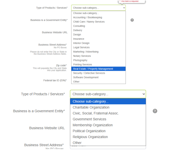 For DBA and full business name enter your business name. Please only enter a business name if you have properly registered the business with your state and if you have an EIN (tax ID number). If you don’t have these, do not enter a business name, just enter your personal name. Do not make up a business name as PaySimple will verify if your business is registered and if it isn't, your application will get rejected. If you don’t have a business registered, use your personal name and select Sole Proprietorship as the business type.